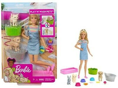 La poupée Barbie aime tous les animaux, en particulier les chiots, les chatons et les lapins. L’ensemble de jeu Barbie Play ‘n’ Wash Pets en a un pour la poupée Barbie pour nourrir, jouer avec, laver et se blottir -plus chacun a également une fonction de changement de couleur cool qui encourage le jeu. Les jeunes amoureux des animaux auront tellement de plaisir à explorer les soins pour animaux de compagnie avec la poupée Barbie et ses trois adorables animaux de compagnie, qui aiment jouer dehors dans les flaques d’eau et se salir. Remplissez le seau décoré d’herbe avec de l’eau froide et mettez n’importe lequel des animaux à l’intérieur pour jouer – oh non, quel gâchis! Des taches boueuses apparaissent! Pour les “laver”, remplissez le seau argenté d’eau tiède, trempez l’animal et “nettoyez” avec la brosse – les taches disparaissent! Répétez encore et encore pour profiter du moment de changement de couleur et du plaisir réconfortant. Trois bols de nourriture et des collations uniques ajoutent des ingrédients pour le temps d’alimentation, et un lit pour animaux de compagnie convient aux trois pour une sieste confortable. Les enfants peuvent jouer toute la journée avec la poupée Barbie et ses trois adorables amis. Elle porte un t-shirt à rayures colorées sous une robe en jean avec des chaussures roses et a des genoux qui se plient pour pouvoir s’occuper du chiot, du minou et du lapin! Collectionne d’autres poupées et jouets Barbie pour encourager encore plus l’imagination car quand une fille joue avec Barbie, elle imagine tout ce qu’elle peut devenir! Comprend une poupée Barbie portant des vêtements et des chaussures, trois animaux de compagnie avec fonction de changement de couleur -un chiot, chaton et lapin -un seau à herbe, un seau de lavage, une brosse, trois bols de nourriture, un tas de carottes, un poisson, un os et un lit pour animaux de compagnie. La poupée ne peut pas rester seule. Les couleurs et les décorations peuvent varier.