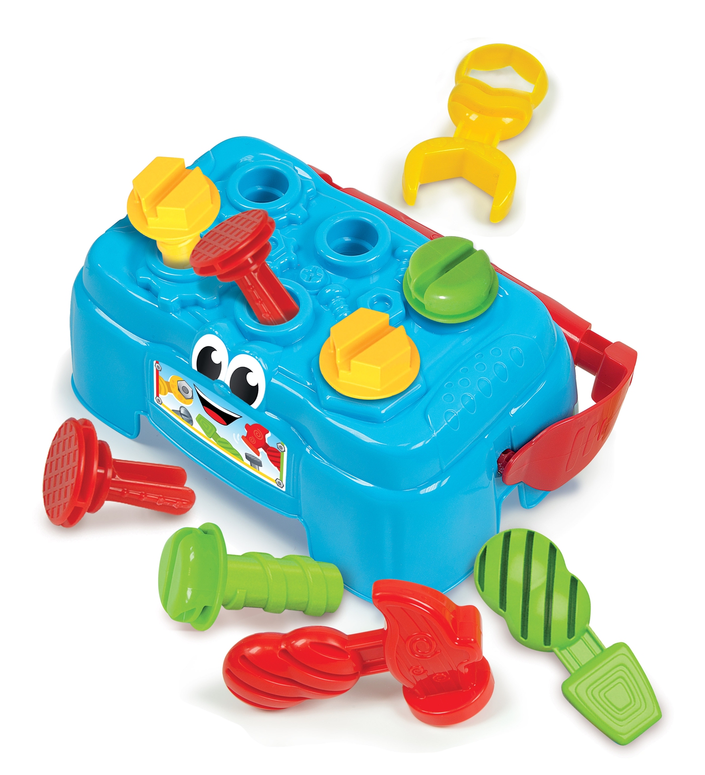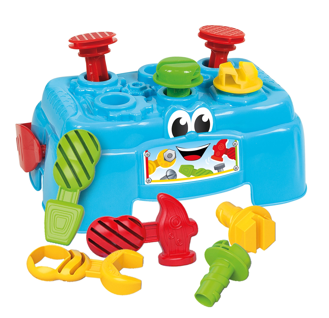 • Une table de travail pour jouer avec trois outils, un marteau, un tournevis et une clé et 6 accessoires, clous, boulons et vis, pour un divertissement riche et interactif.