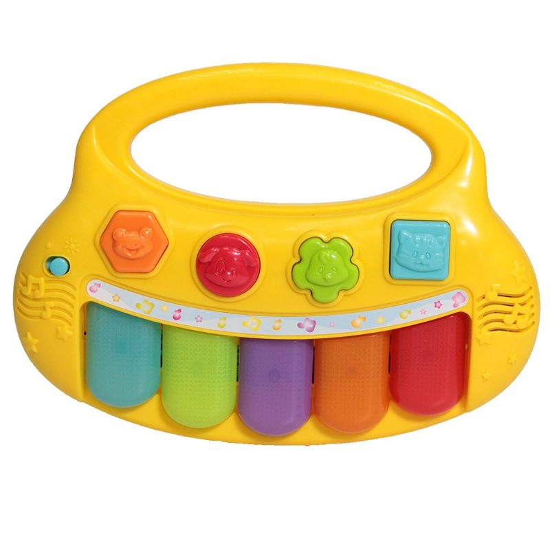 Piano avec clavier de 5 notes à lumières clignotantes,bruitages animaliers et loufoques ainsi que des notes de musiques et mélodies entraînantes.