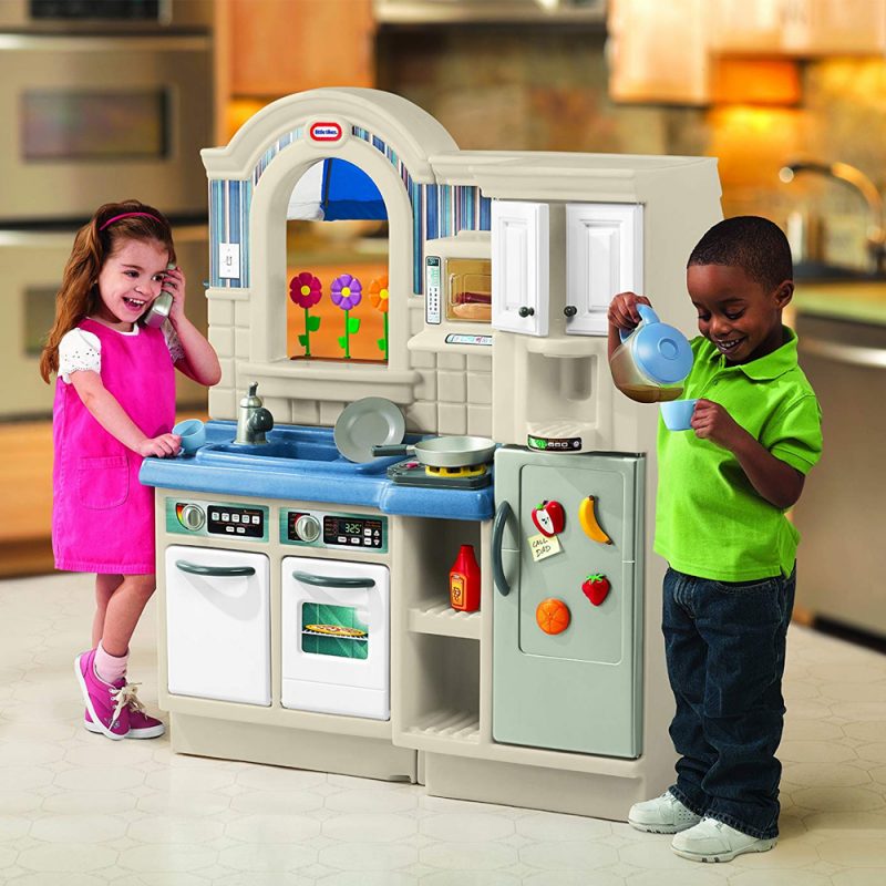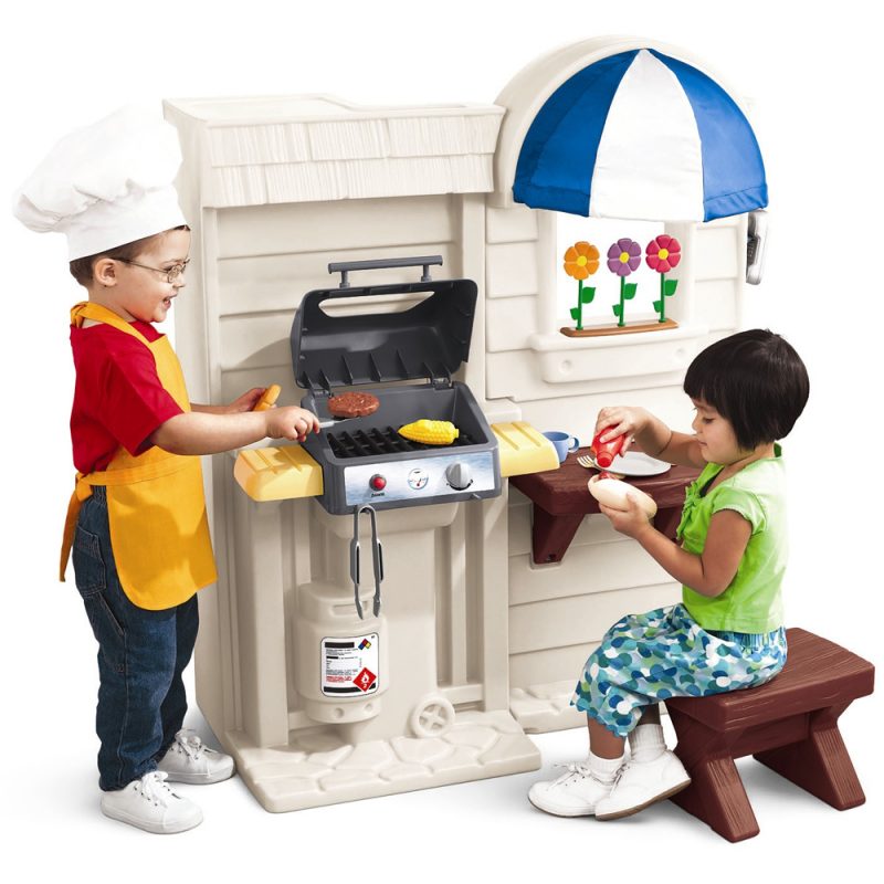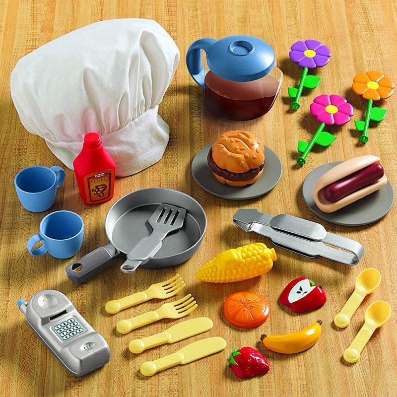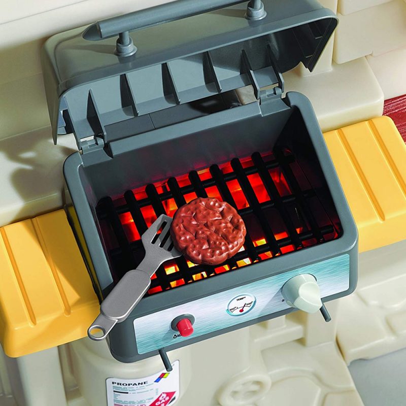 Cuisine de luxe 2 en 1 et pique-nique au barbecue 26 accessoires supplémentaires comprenant des casseroles, poêles, assiettes, couverts, plats pour barbecue, épis de maïs et un téléphone Plaque de cuisson complète avec sons de cuisson et “flammes” réalistes Réfrigérateur magnétique.