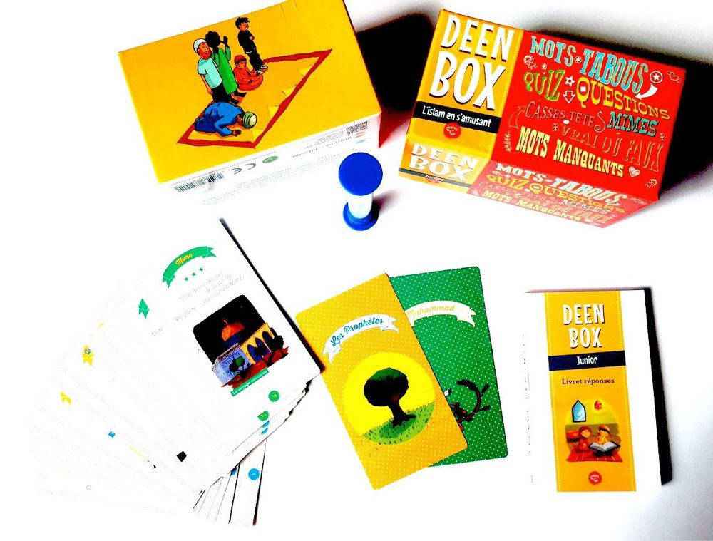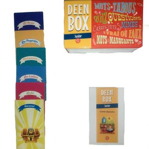 Contenu : 114 cartes (100 cartes défis, 5 cartes thèmes, 8 cartes hasanat et 1 carte règlement) – 1 livret avec le règlement, les réponses et un tas d’informations – 1 sablier 1’30”