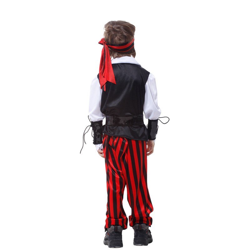 La tenue comprend également un pantalon rouge et noir dentelé et élastique à la taille, un bandana assorti ainsi qu’un cache oeil pirate.