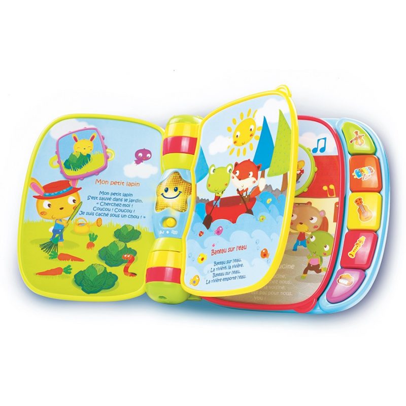 Un livre parlant et musical avec 6 comptines traditionnelles à écouter : « Dansons la Capucine », « Frère Jacques »…