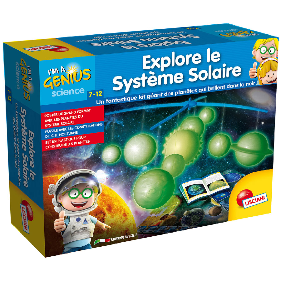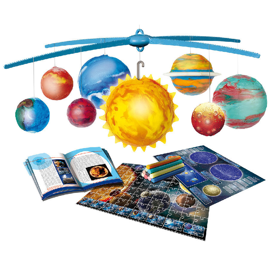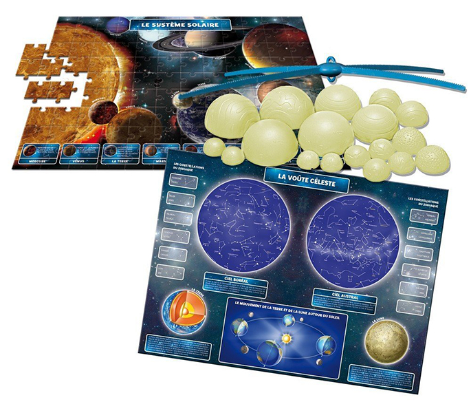 Dans la boîte, Les petits astronautes trouveront une reproduction soignée, réaliste et en 3 dimensions du système solaire, ainsi qu’un livre présentant le portrait robot de toutes les planètes. Ce coffret contient également un puzzle, un poster et un manuel d’astronomie. Les planètes brillent dans le noir. Vendu avec une structure pour suspendre au plafond la maquette du système solaire une fois montée.