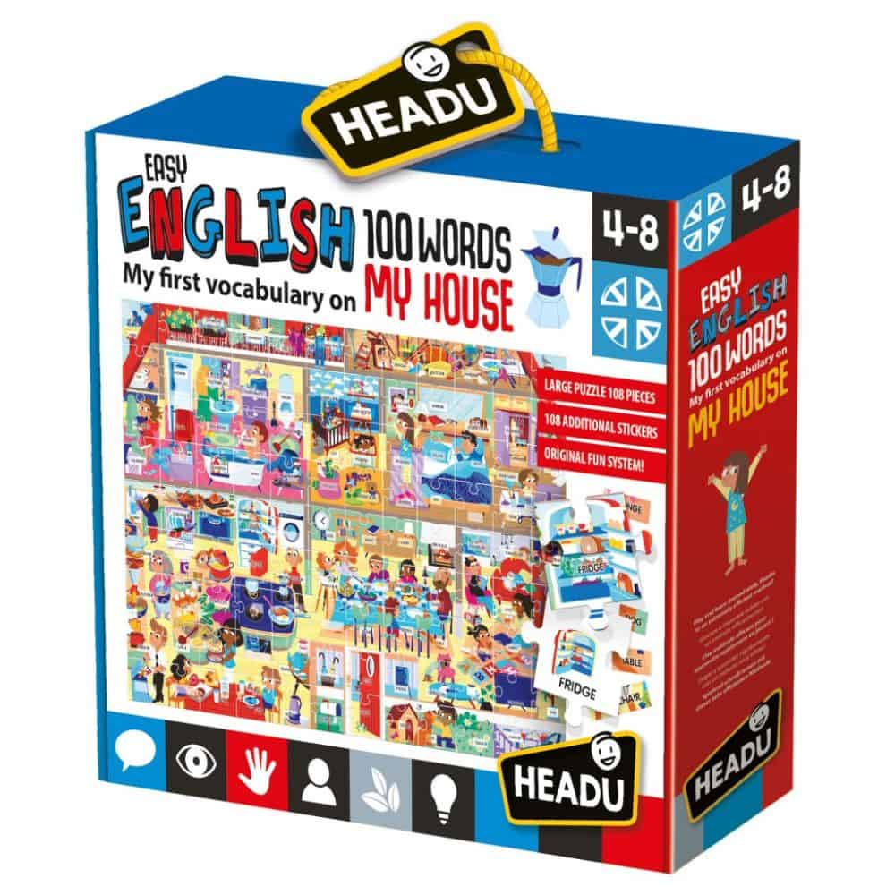 Ce kit, réalisé avec des matériaux résistants, contient plus de 100 adhésifs adhésifs et un puzzle géant avec des jetons spéciaux pour apprendre beaucoup de mots relatifs à la maison colorée. Grâce à l’application dédiée, la prononciation sera correcte !