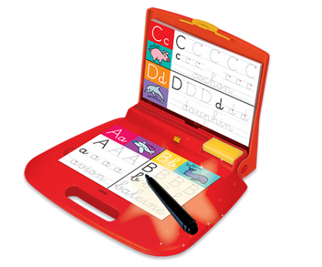 L’enfant s’exerce aux premiers gestes de l’écriture (lignes droites, vagues, ronds…) et découvre les 26 lettres de l’alphabet. Le pupitre lumineux lui donne le modèle pour écrire ses premiers mots avec un système pratique d’autocorrection