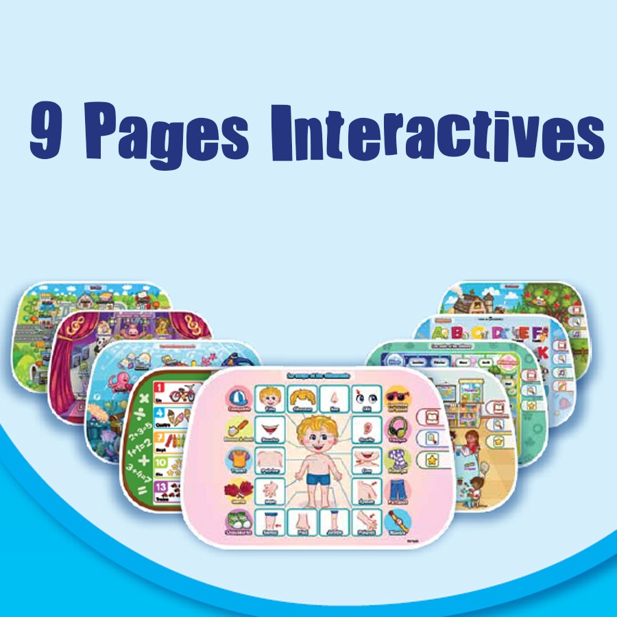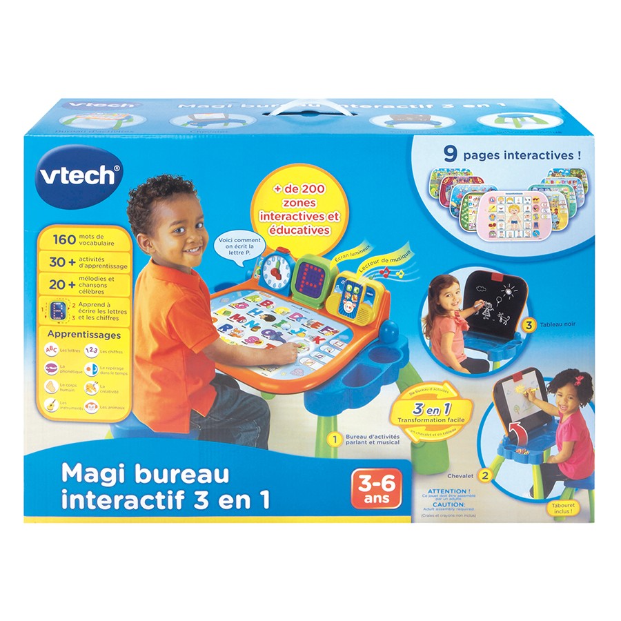 - Bureau, avec écran interactif pour apprendre à tracer les lettres et les chiffres, découvrir l’heure avec l’horloge intégrée, écouter de la musique, dessiner et faire plein de découvertes grâce aux 8 fiches interactives sur les thèmes du corps humain, de la ville, de la ferme, des animaux, du monde sous-marin …