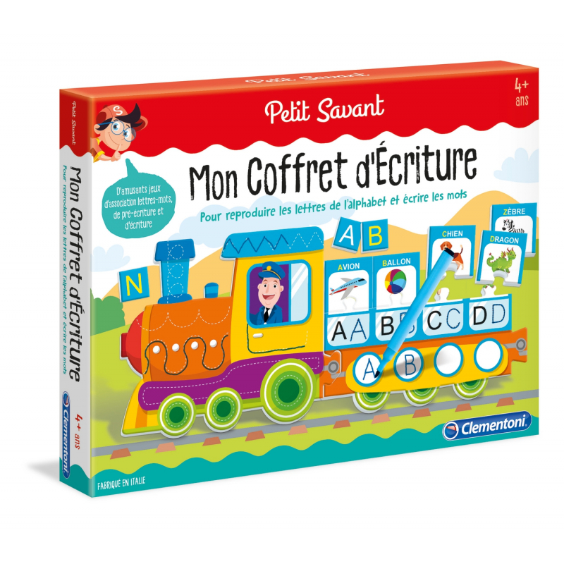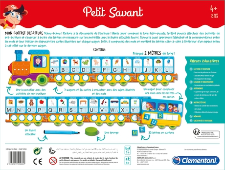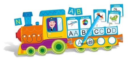 - Un long train pour recomposer et de nombreux exercices de pré-écriture et d’écriture. Les enfants peuvent écrire des lettres dans chaque chariot à l’aide d’un marqueur effaçable spécial. Avec les lettres en carton, ils peuvent également recomposer tous les mots écrits à la fin du train.