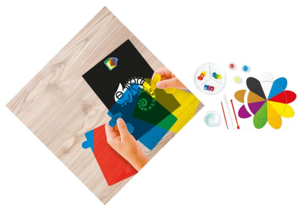 Le coffret contient une fleur colorée avec 9 couleurs, 3 gélatines (rouge, jaune, bleu), 4 feuilles de couleurs primaires/secondaires, 12 feuilles recto-verso à colorier et un sachet avec 3 peintures de couleur (rouge, jaune, bleu), 3 plaquettes transparentes, un verre, une pipette, une palette et un pinceau.