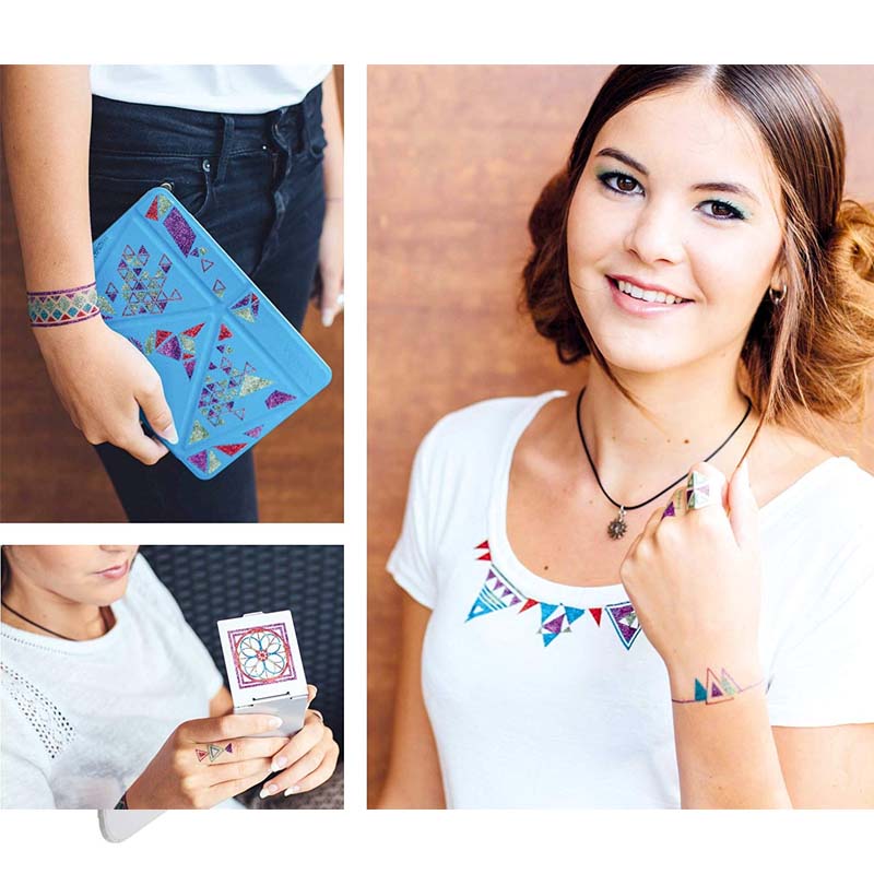 Motifs Pailletés Multi Support : Crazy Geometry te permettra d’ajouter une touche pailletée à ta peau mais aussi tous tes objets préférés, tes vêtements ou encore ton téléphone.