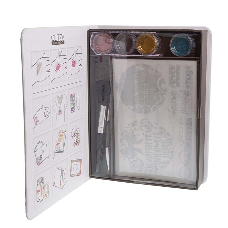 Contenu : 3 planches de transfert, 4 pots poudre paillette, 3 pinceaux de différentes taille et un mode d’emploi.