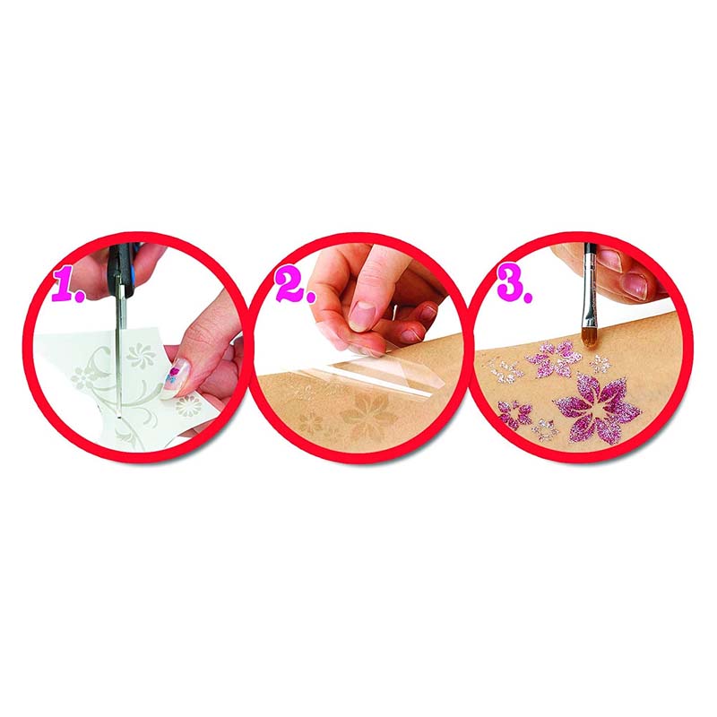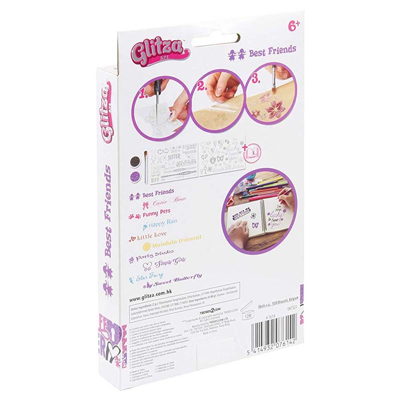 Éclatez votre mode avec les tatouages scintillants de Glitza! Choisissez votre motif de tatouage et appuyez simplement sur vos vêtements, votre téléphone, votre peau, vos chaussures et vos accessoires, puis scintillez-les avec votre propre combinaison de paillettes pour éblouir vos amis! Ils sont si faciles à utiliser et amovibles que vous pouvez impressionner vos amis avec un nouveau look et un nouveau style quand vous en avez envie!.