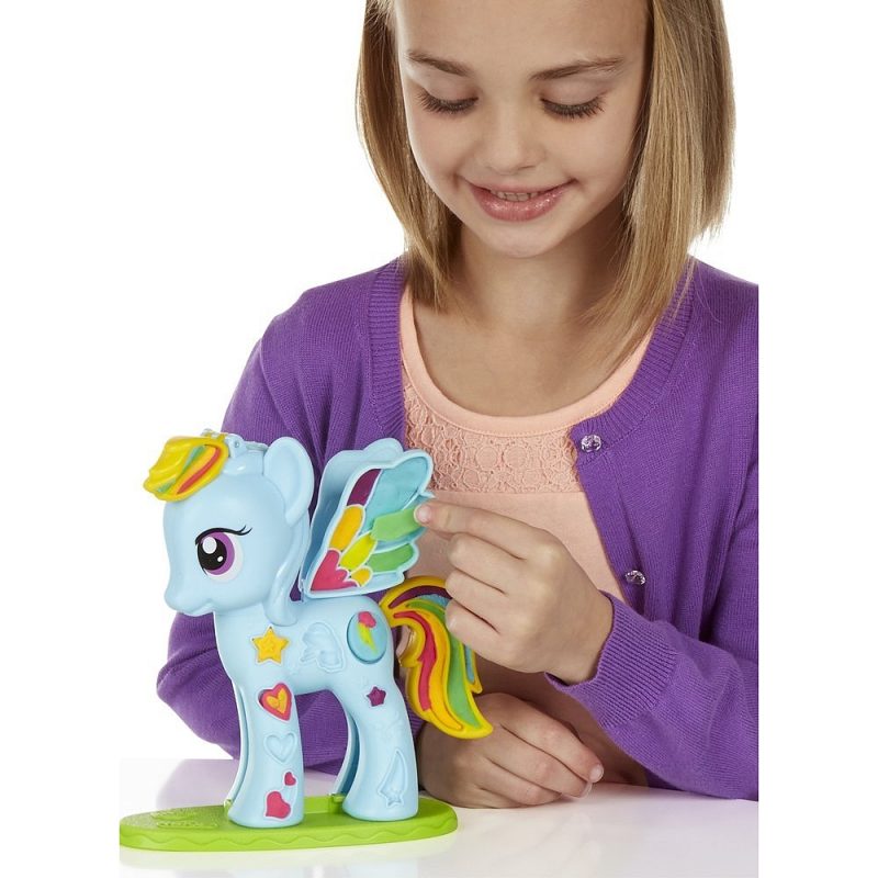 My Little Pony Chevelure de rêve Play-Doh. Contient 6 petits pots de pâte à modeler et des ciseaux pour décorer Rainbow Dash avec la pâte à modeler Play-Doh.