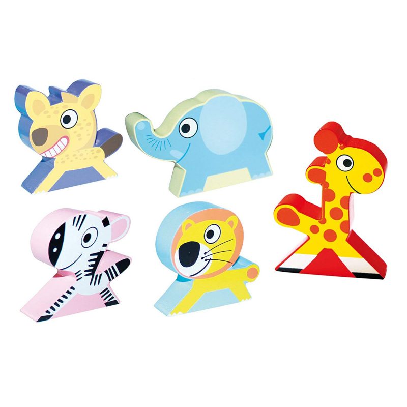 1 puzzle de 50x70cm composé de 24 pièces, 5 animaux en bois, 1 dés coloré en bois, 1 livret d’instructions