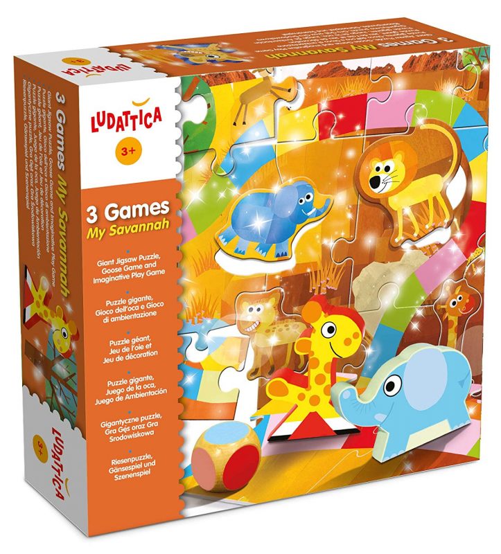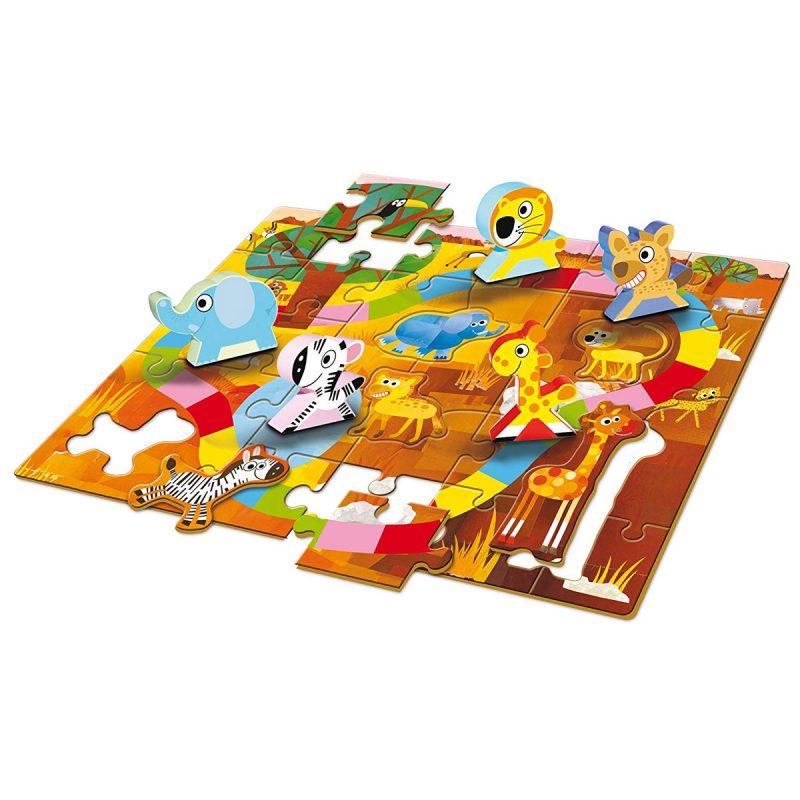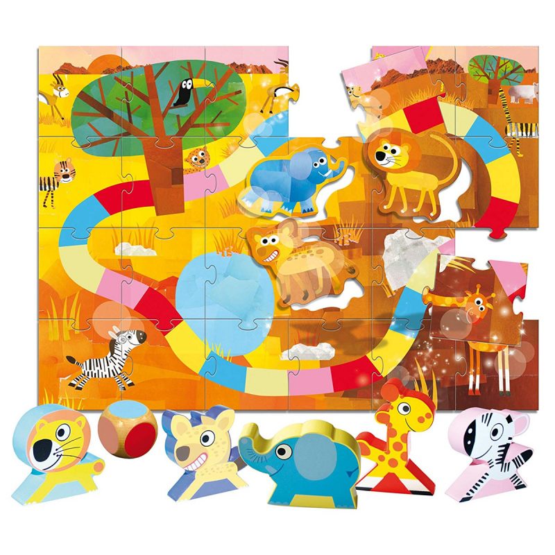 Ce joli jeu de l’oie est très astucieux : le dé indique une couleur et non un chiffre, sur laquelle l’enfant pose son pion. Il peut ainsi se déplacer, même s’il ne sait pas encore compter. C’est aussi un grand puzzle qui représente l’univers de la savane et les animaux qui y vivent. Les animaux en bois sont de bonne qualité et bien adaptés aux petites mains de nos enfants! Ils découvriront ce bel univers avec un graphisme original et coloré et pourront jouer à la savane, en utilisant le puzzle comme un tapis de jeu.