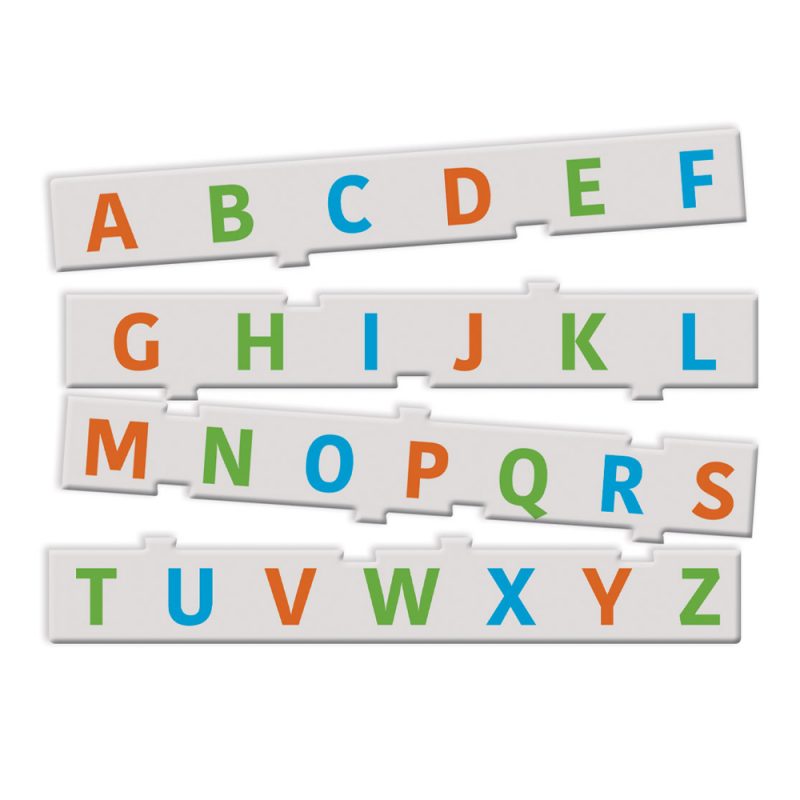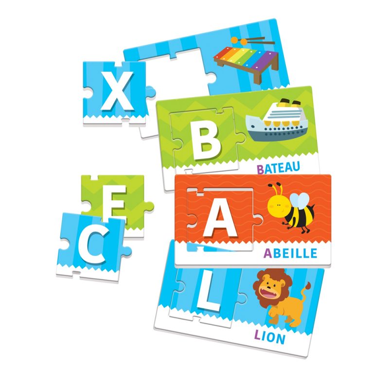 Contenu : 26 cartes image – mot, 26 pièces lettre, 1 puzzle alphabétique, 1 guide de jeu.