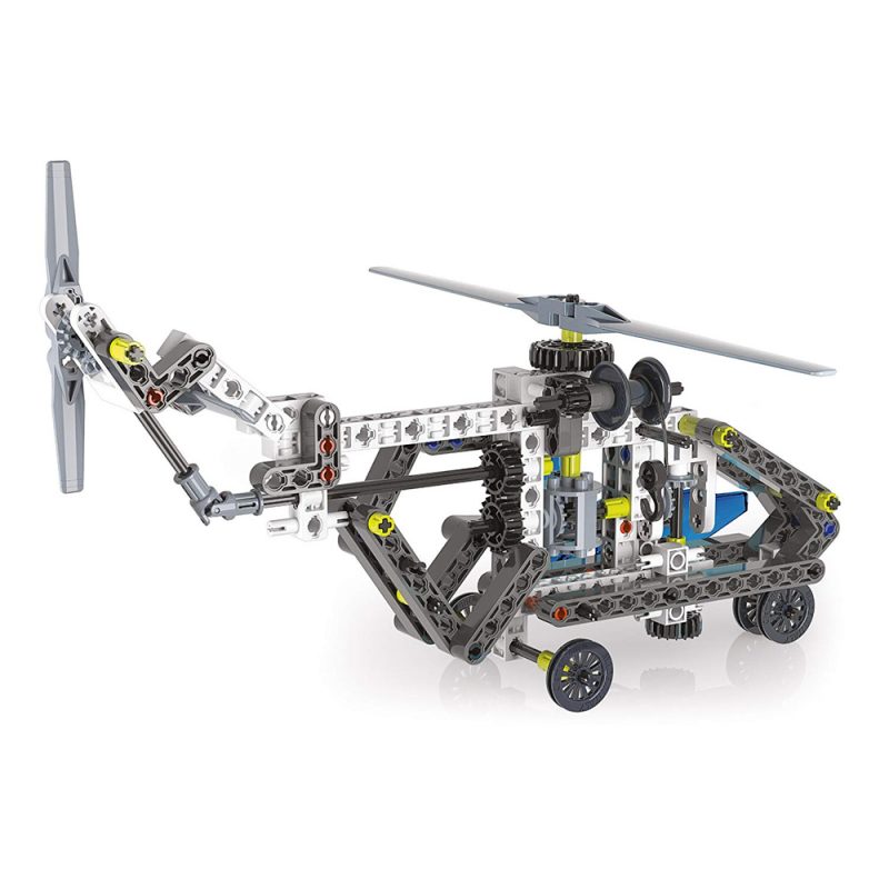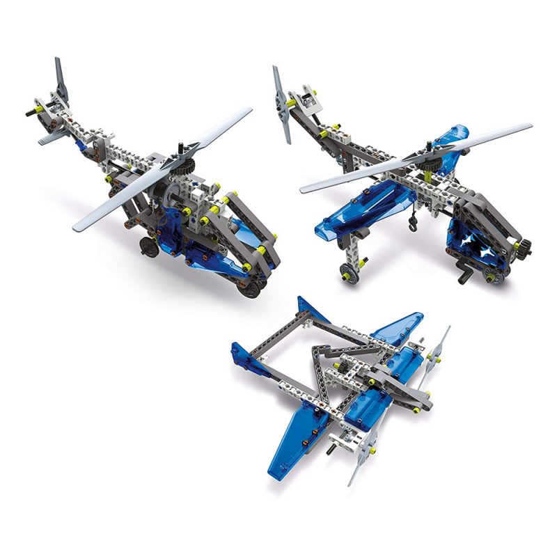 10 modèles à construire grâce aux 200 composants à assembler dont : tiges pour assembler le fuselage, panneaux, hélices, engrenages et poulies, etc.