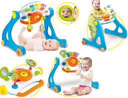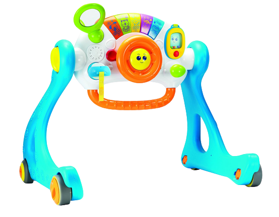 Grow-with-me Gym Walker comprend un panneau de jeu amovible pour jouer assis, debout ou en marchant ! -Le panneau de jeu réglable peut être incliné pour répondre aux besoins de développement de bébé. – Les pieds solides avec des roues texturées incluent des verrous de sécurité. – Clé de voiture détachable et téléphone mobile – Comprend un klaxon, un levier de vitesses, une clé de contact, une roue qui tourne et un miroir sans danger pour bébé – Clavier avec piano avec 5 touches activant les lumières clignotante et des sons et mélodies animales amusantes -Pieds amovibles pour un transport et un rangement faciles ! Âge: 3 mois +