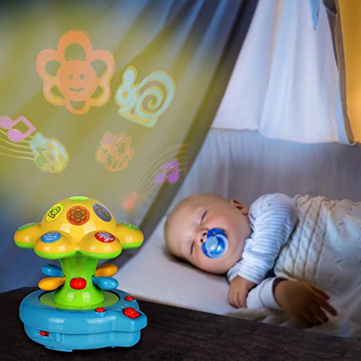 Petite veilleuse tournante à fleurs avec des motifs colorés et des sons de musique ou de nature.
